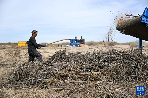 4月28日,在杭錦旗境內(nèi)的庫(kù)布其沙漠,治沙工人在平整裁剪后的沙柳。(新華社記者 李志鵬 攝)