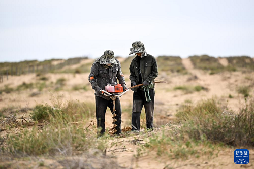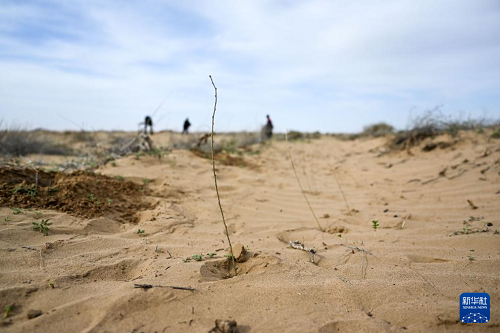 4月28日,在杭錦旗境內(nèi)的庫(kù)布其沙漠,治沙工人在栽種沙柳。(新華社記者 李志鵬 攝)