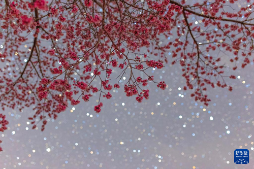 5月3日在黑龍江省佳木斯市杏林湖公園拍攝的含苞待放的榆葉梅與北斗七星。新華社發(fā)( 陳志國(guó) 攝)