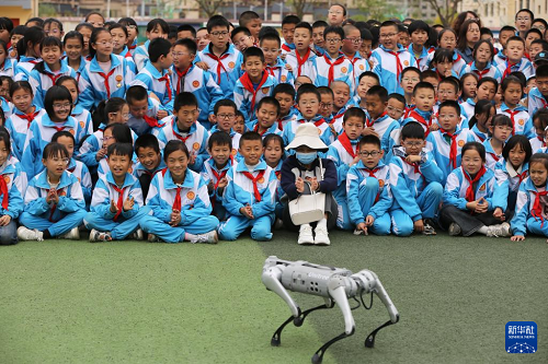 5月7日,甘肅省定西市安定區(qū)東關(guān)小學(xué)的學(xué)生在觀看機(jī)器狗表演。(新華社發(fā) 王克賢 攝)