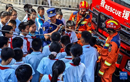 5月9日,在云南省普洱市景谷縣森林消防中隊(duì),消防員向?qū)W生講解滑輪在救援中的運(yùn)用。(新華社發(fā) 郭元首 攝)
