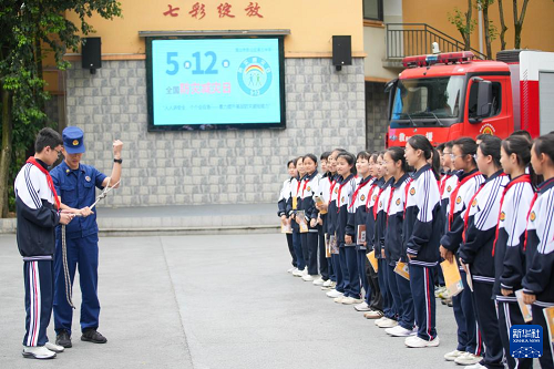 5月9日,消防救援人員給四川省眉山市彭山區(qū)第三中學(xué)的學(xué)生講解安全繩知識(shí)。(新華社發(fā) 翁光建 攝)