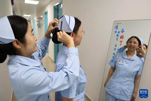 5月12日,山東省濱州市陽信縣中醫(yī)醫(yī)院心內(nèi)科的護士在互相整理護士帽。(新華社發(fā) 初寶瑞 攝)