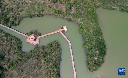 這是黃河三角洲國家級自然保護(hù)區(qū)內(nèi)的濕地(5月14日攝,無人機(jī)照片)。(新華社記者 徐速繪 攝)