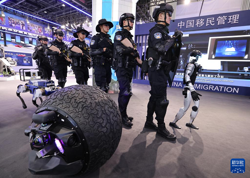 5月14日,在第十二屆中國(guó)國(guó)際警用裝備博覽會(huì)移民管理裝備展區(qū),民警和球形機(jī)器人、警用機(jī)器狗和具身人形智能警務(wù)機(jī)器人(右一)一起進(jìn)行巡邏演練。(新華社記者 殷剛 攝)