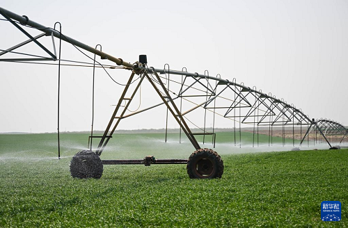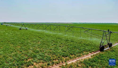 5月22日,在赤峰市阿魯科爾沁旗,自走式噴灌機在為牧草澆水。(新華社記者 彭源 攝)