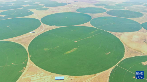 5月22日,赤峰市阿魯科爾沁旗境內的自走式噴灌機在為牧草澆水(無人機照片)。(新華社記者 彭源 攝)