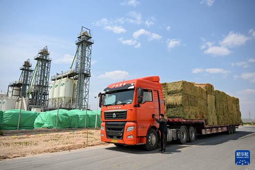 5月22日,在赤峰市阿魯科爾沁旗,一輛滿載牧草的貨車準備啟程運輸。(新華社記者 彭源 攝)