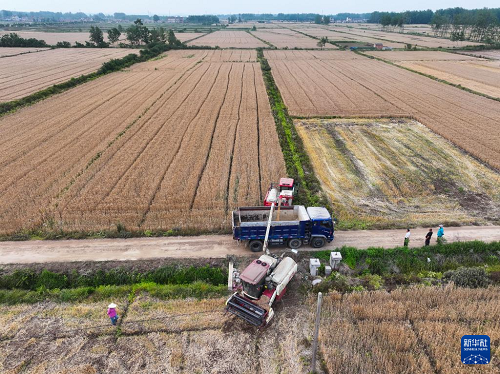 在盱眙縣種糧大戶劉凱的承包田旁,收割機(jī)將小麥裝車(5月27日攝,無人機(jī)照片)。(新華社記者 季春鵬 攝)