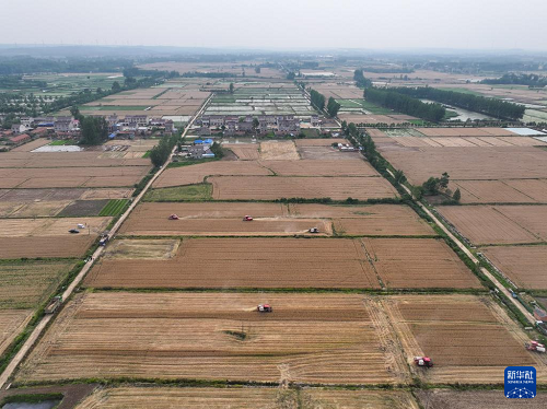 在盱眙縣種糧大戶劉凱的承包田,農(nóng)機(jī)手駕駛收割機(jī)搶收小麥(5月27日攝,無人機(jī)照片)。(新華社記者 季春鵬 攝)