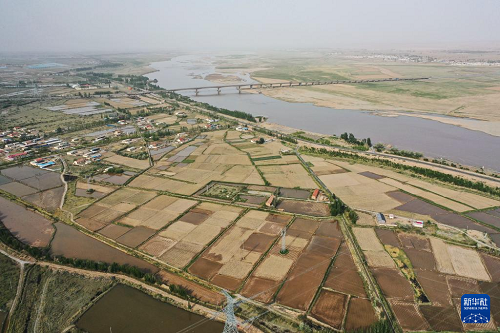 這是5月28日拍攝的巴彥淖爾市磴口縣境內(nèi)的農(nóng)田(無(wú)人機(jī)照片)。(新華社記者 李志鵬 攝)