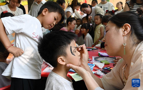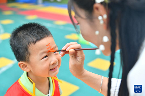 5月28日,在河南省沁陽市白莊村幼兒園,老師為小朋友畫面部彩繪。(新華社發(fā) 楊帆 攝)