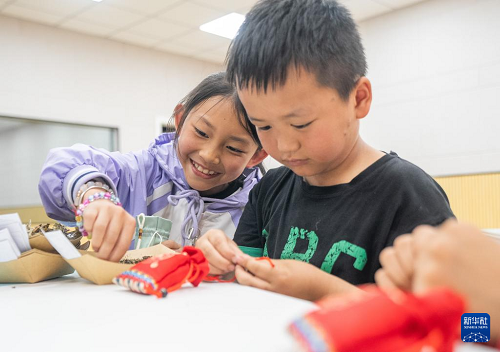 5月27日,貴州省畢節(jié)市七星關(guān)區(qū)甘河街道中心校的孩子們?cè)诶蠋熤笇?dǎo)下制作香囊。(新華社發(fā) 羅大富 攝)