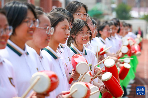 6月3日,在江蘇省海安市實(shí)驗(yàn)中學(xué),高一女子花鼓社團(tuán)的同學(xué)們?cè)跒楦呷龑W(xué)長加油助威。(新華社發(fā) 顧彬斌 攝)