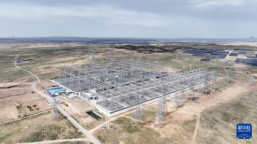 6月8日拍攝的寧國運靈武100萬千瓦光伏復合項目330千伏輸變電工程線路終點——北地750千伏變電站(無人機照片)。(新華社記者 王鵬 攝)