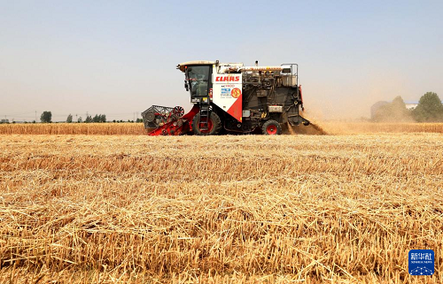 6月12日,收割機(jī)在河北省邢臺市隆堯縣雙碑鄉(xiāng)西良村麥田里收獲小麥。(新華社記者 牟宇 攝)