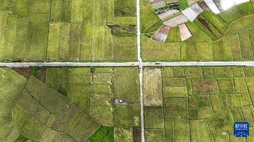 這是7月2日拍攝的廣西欽州市康熙嶺鎮(zhèn)的早稻田(無(wú)人機(jī)照片)。(新華社記者 張愛(ài)林 攝)