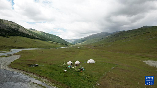 7月2日,在新疆阿勒泰市野卡峽,剛剛轉(zhuǎn)場而來的牧民們已搭建好氈房(無人機(jī)照片)。(新華社發(fā) 王友波 攝)