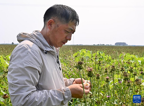7月8日,一名種植戶(hù)在查看水飛薊成熟情況。(新華社記者 吳青昊 攝)