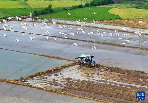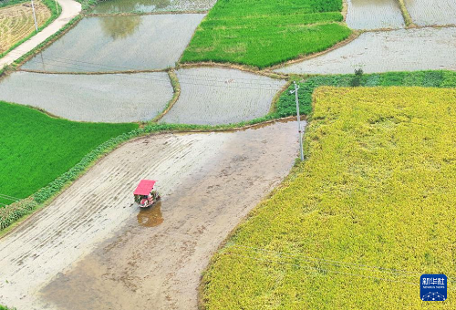 7月13日,湖南省衡陽(yáng)市衡東縣霞流鎮(zhèn)農(nóng)民駕駛農(nóng)機(jī)翻耕稻田(無(wú)人機(jī)照片)。(新華社發(fā) 曹正平 攝)