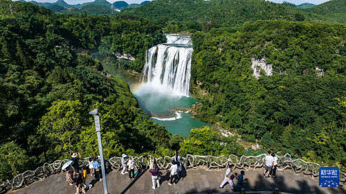 7月16日,游客在貴州省安順市黃果樹瀑布景區(qū)游覽(無人機(jī)照片)。(新華社記者 陶亮 攝)