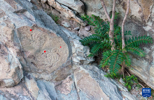 這是7月23日在賀蘭山巖畫景區(qū)拍攝的巖畫和紅色標(biāo)識(shí)點(diǎn)(無人機(jī)照片)。標(biāo)識(shí)點(diǎn)方便游客找到巖畫,可以隨時(shí)粘貼,對(duì)石質(zhì)和文物不會(huì)產(chǎn)生影響。(新華社記者 楊植森 攝)