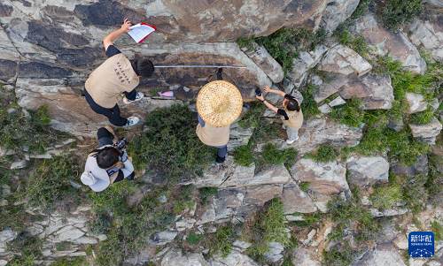 7月23日,工作人員在賀蘭山巖畫遺址區(qū)內(nèi)進(jìn)行2025年度巖畫復(fù)查(無人機(jī)照片)。(新華社記者 楊植森 攝)
