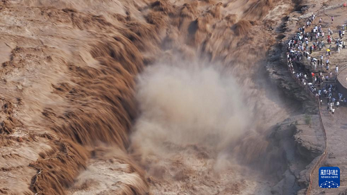 7月27日,人們在山西吉縣觀看黃河壺口瀑布(無人機照片)。(新華社發(fā) 呂桂明 攝)