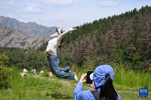 7月30日,游客在賀蘭山國家森林公園拍照留影。(新華社發(fā) 陳周旭洋 攝)