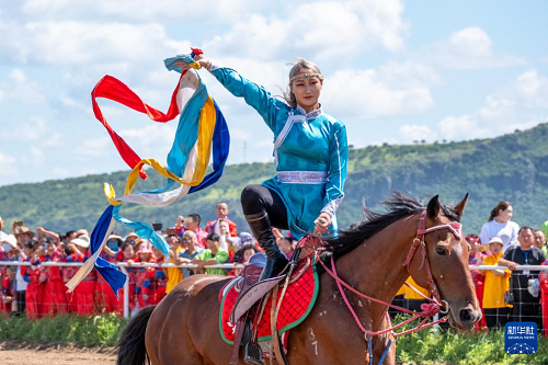 8月7日,演員在農(nóng)牧民那達慕大會上表演馬術(shù)。(新華社記者 馬金瑞 攝)
