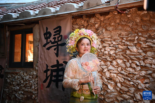 8月18日,體驗(yàn)“簪花圍”的游客在蟳埔村的蚵殼厝旁拍照。(新華社記者 肖瀟 攝)