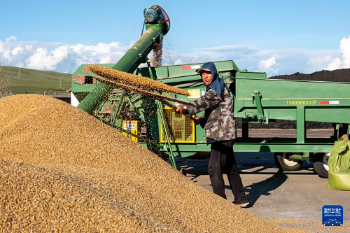 8月20日,呼倫貝爾農(nóng)墾拉布大林農(nóng)場的工人整理收獲的小麥。(新華社記者 馬金瑞 攝)