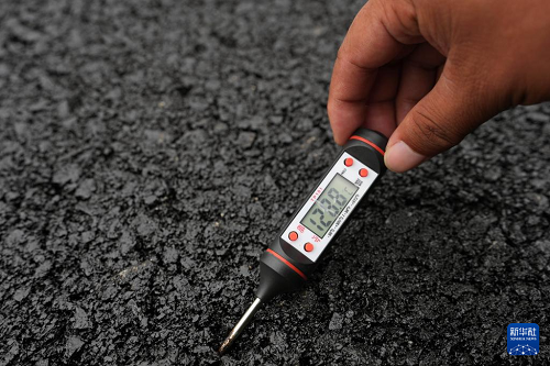 8月28日,技術(shù)人員在監(jiān)測攤鋪瀝青溫度。(新華社記者 王松 攝)