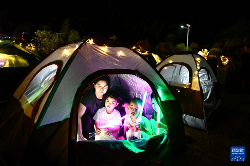 8月29日,在湖北省咸寧市通城縣黃龍林場,游客搭起帳篷,享受露營的樂趣。(新華社發(fā) 劉建平 攝)