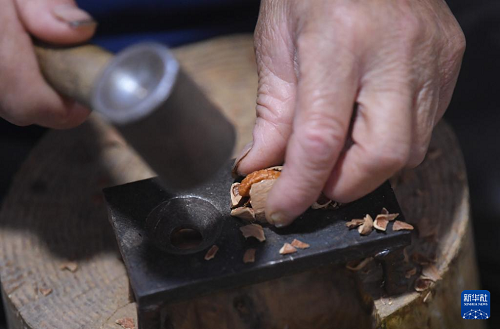 9月9日,在臨安龍崗鎮(zhèn)一家山核桃生產(chǎn)企業(yè),工作人員通過(guò)手敲山核桃取整仁。(新華社記者 翁忻旸 攝)