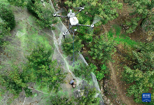 9月9日,在臨安島石鎮(zhèn)的一片山核桃林上方,農(nóng)用無(wú)人機(jī)將采收的山核桃運(yùn)送出山(無(wú)人機(jī)照片)。(新華社記者 翁忻旸 攝)