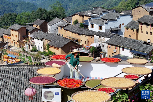 秋收時節(jié),在安徽省黃山市歙縣深渡鎮(zhèn)陽產(chǎn)村,村民利用晴好天氣,抓緊晾曬收獲的辣椒、玉米、山核桃等農(nóng)作物,描繪出一幅山村“曬秋”圖。