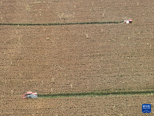 9月21日,收割機(jī)在地里收割高粱(無人機(jī)照片)。(新華社記者 季春鵬 攝)