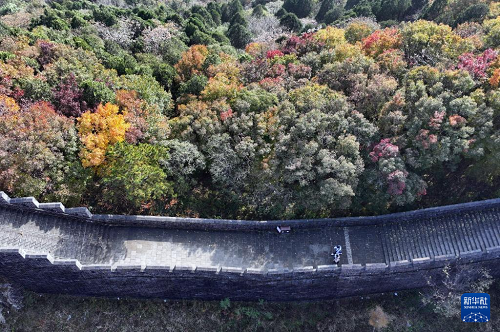 10月28日拍攝的天津市薊州區(qū)黃崖關(guān)長城秋景(無人機(jī)照片)。(新華社記者 李然 攝)