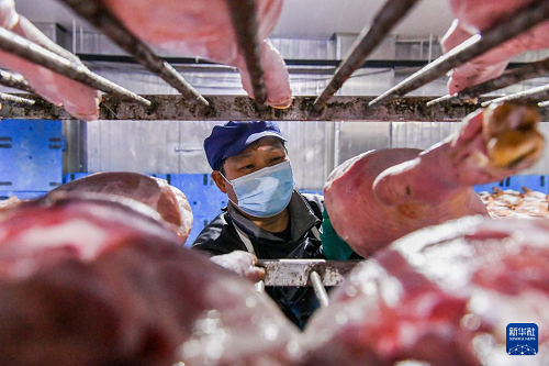 11月6日,在浙江省金華金年火腿有限公司車間內(nèi),技師在堆疊火腿。(新華社發(fā) 時(shí)寬兵 攝)