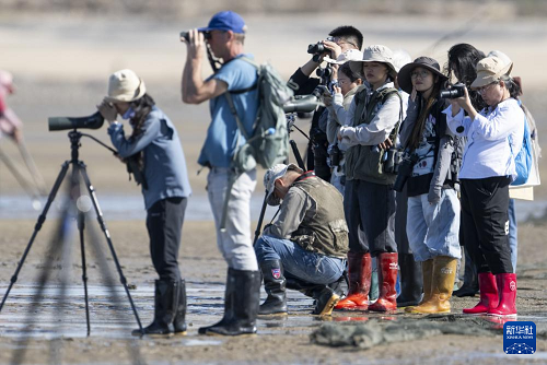 11月9日,中外觀鳥愛好者在泉州圍頭灣灘涂上觀測(cè)勺嘴鷸。(新華社記者 魏培全 攝)