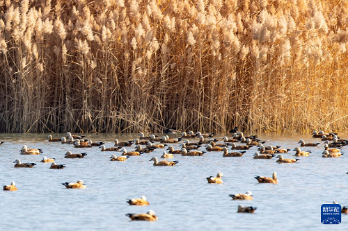 11月12日,赤麻鴨等鳥類在張掖黑河濕地國家級自然保護(hù)區(qū)高臺段一處湖泊休憩覓食。(新華社記者 張智敏 攝)