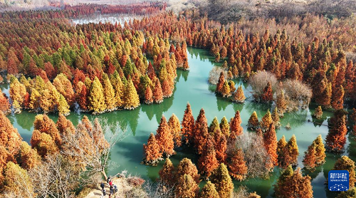 12月14日在昆明市盤龍區(qū)滇源街道甸尾村拍攝的水杉濕地景色(無(wú)人機(jī)照片)。(新華社發(fā) 梁志強(qiáng) 攝)