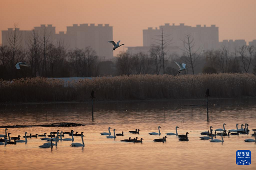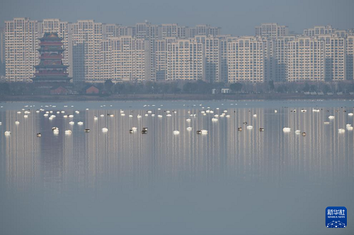 進入冬季,成群的候鳥飛抵安徽省滁州市明湖公園,在此休憩、覓食。明湖公園是一座融合自然景觀與人文景觀的城市公園,優(yōu)良的水質、豐茂的水草和豐富的魚蝦資源,使這里逐漸成為天鵝等越冬候鳥和各種鳥類的棲息地。