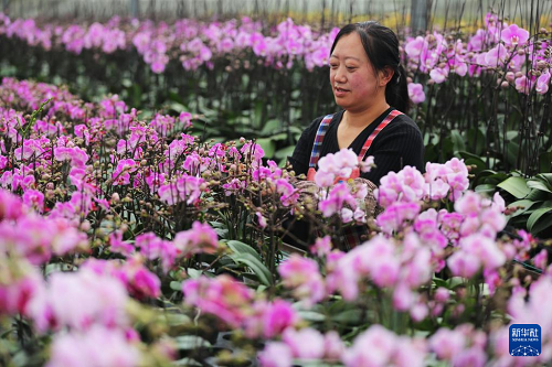 12月23日,甘肅省定西市臨洮縣一花卉種植基地的工人在管護(hù)蝴蝶蘭。(新華社發(fā) 王克賢 攝)