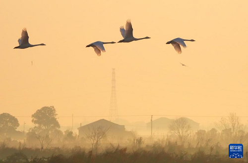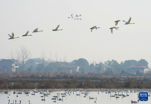 1月14日,越冬候鳥在湖南省岳陽市屈原管理區(qū)東古湖濕地上空翱翔。(新華社發(fā) 曹正平 攝)