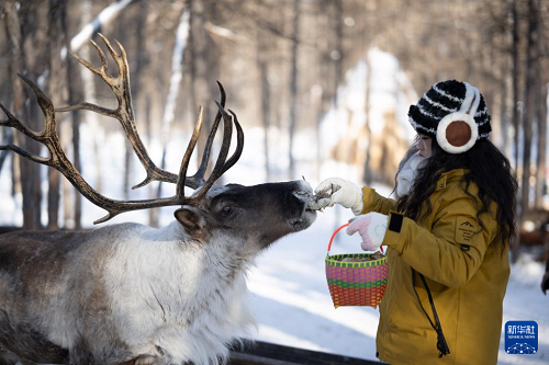 1月15日,游客在根河市敖魯古雅鄂溫克民族鄉(xiāng)敖魯古雅使鹿部落景區(qū)與馴鹿互動。(新華社記者 徐嘉懿 攝)