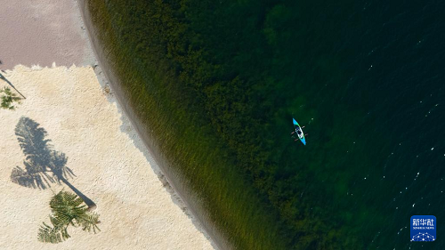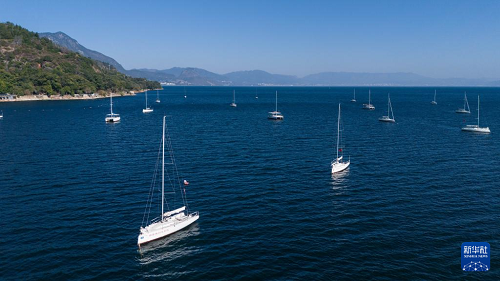 1月27日,游客在云南省玉溪市撫仙湖劃船游玩(無(wú)人機(jī)照片)。(新華社記者 高詠薇 攝)