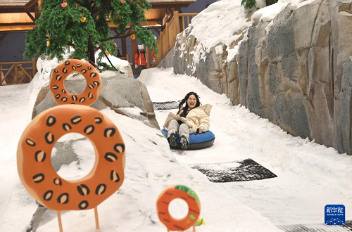 2月3日,一名游客在體驗(yàn)雪道滑行游戲。(新華社記者 方喆 攝)