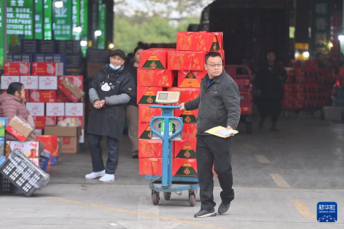 2月11日,在柳州市柳南區(qū)瑞龍路一家農(nóng)產(chǎn)品批發(fā)市場(chǎng),商家在搬運(yùn)水果。(新華社記者 黃孝邦 攝)